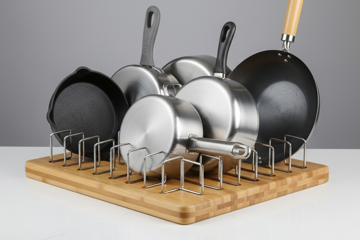 Why customers love it: No more noisy pot stacks; quick access to any pan; makes cabinets feel spacious.